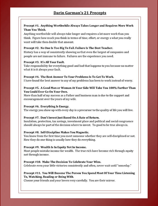 I have finally released MY 21 MULTI-FAMILY PRECEPTS! Ā It takes discipline and fortitude to be the best in multi-family and these 21 PRECEPTS outlines exactly what you need. Ā Question is, will you follow them? Ā Download them now, read them daily, Ā hang them on your wall and watch the results!